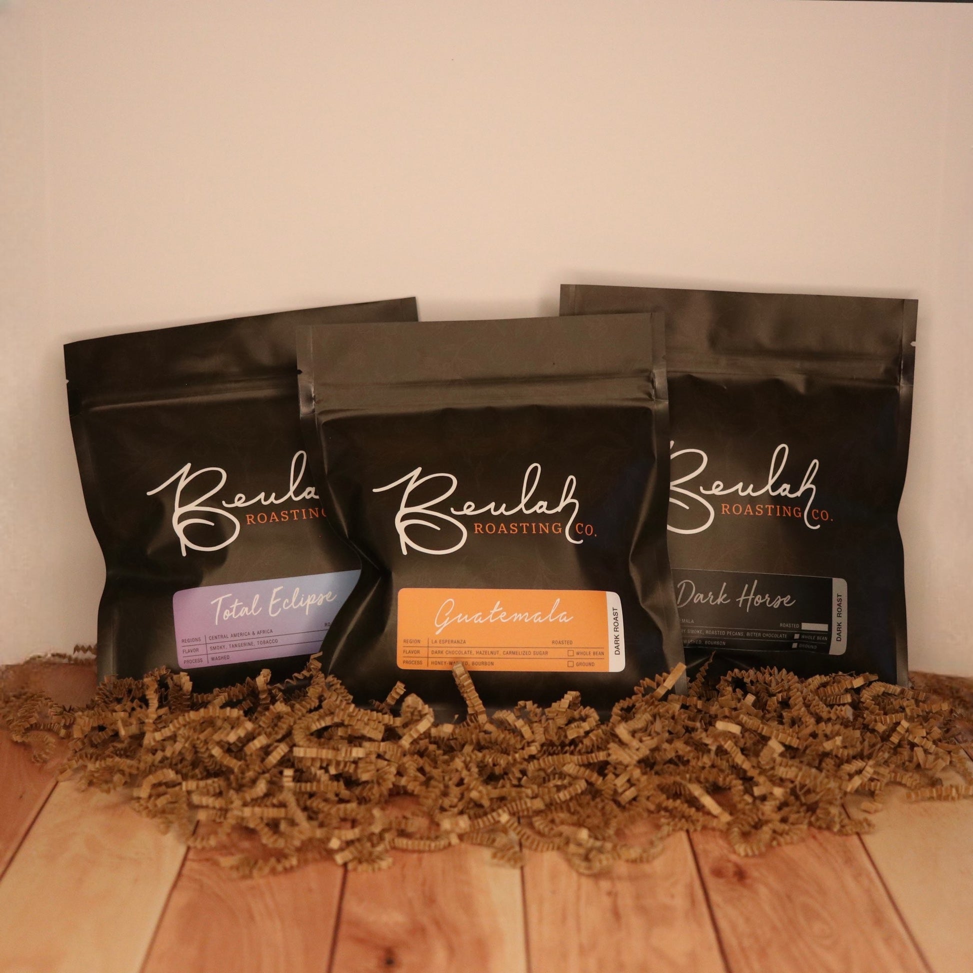 Our sample pack is made up of three (4) oz bags of coffee. This sample now comes in two options our medium sample pack includes Ethiopia light roast, Rise and Shine, and Guatemala Medium Roast. The dark roast sample pack includes Dark Horse, Total Eclipse, and Guatemala Dark Roast. This sample pack also includes one Beulah graphic sticker "Drink good coffee, grow a garden, hear the earth sing".